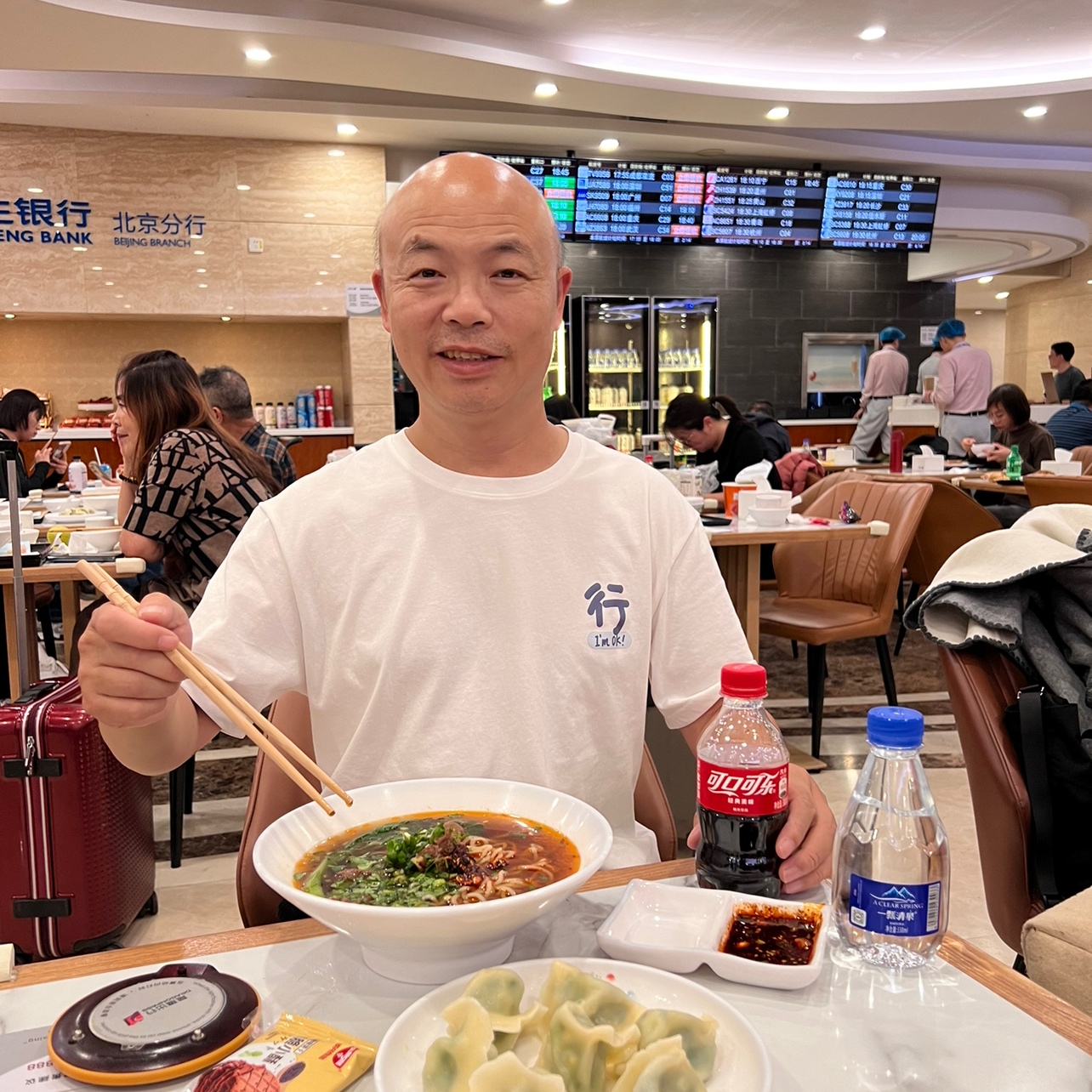 好不容易找到位子但是少一个椅子用了一箱水直接坐下吃