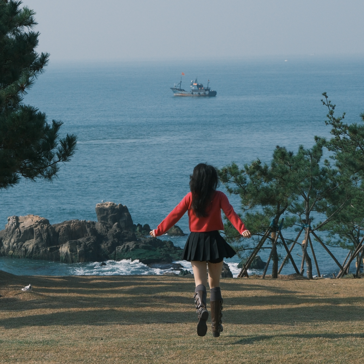 草坪坡上的一颗孤独大树,以海边的礁石和大海为背景,非常浪漫(可以带一些小道具)